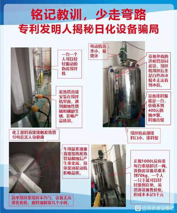 洗潔精洗衣液車用尿素設(shè)備銷售者五花八門,許多不法商販炮制萬元投資可辦廠的謊言,推銷低價(jià)偽劣洗潔精設(shè)備,洗衣液設(shè)備,車用尿素設(shè)備,無數(shù)初創(chuàng)業(yè)者上當(dāng)受騙血本無歸,為了讓創(chuàng)業(yè)者少走彎路,受良心驅(qū)使,公開揭示日化設(shè)備騙局,以此讓大家少走彎路。