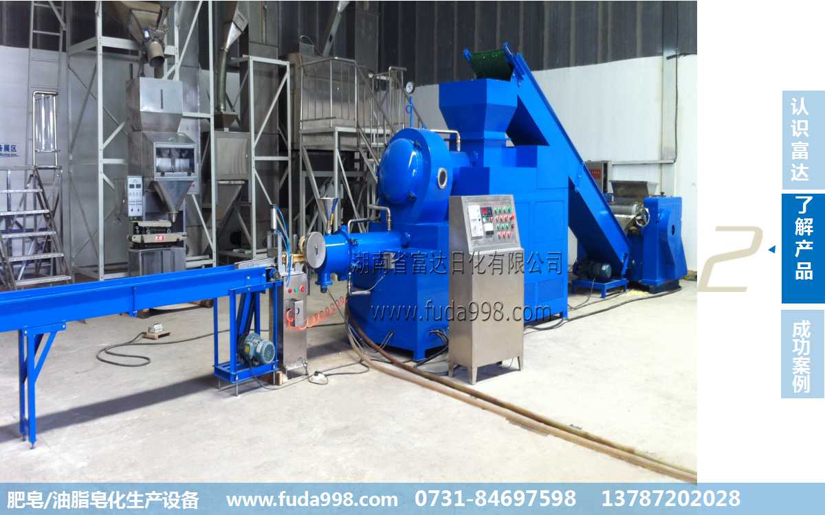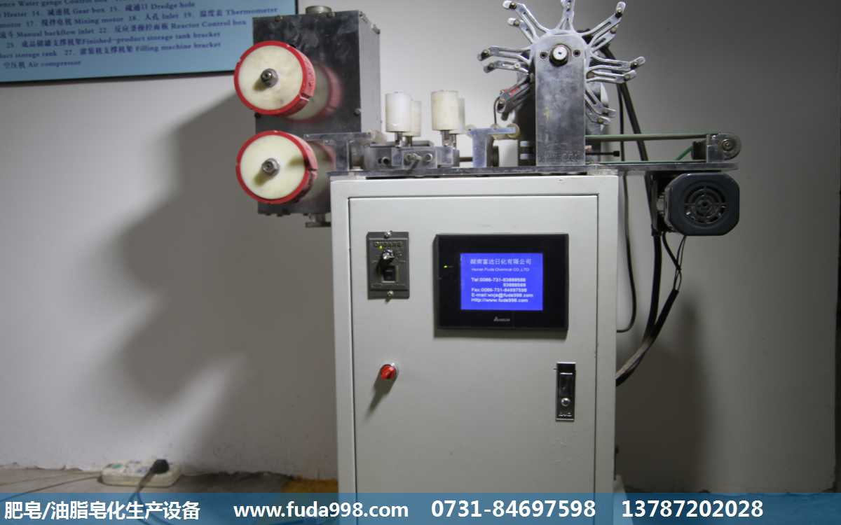 (2)用半成品皂泥:通過從大廠購買皂粒(皂泥),采用FZ-1000肥皂生產(chǎn)線,主要有三棍研磨機(jī)、半成品輸送機(jī)、雙螺旋真空抽條機(jī)、真空泵、肥皂滾印切塊機(jī)等設(shè)備組件構(gòu)成,通壓條,切塊,打印,包裝,最后生產(chǎn)出合格的肥皂。