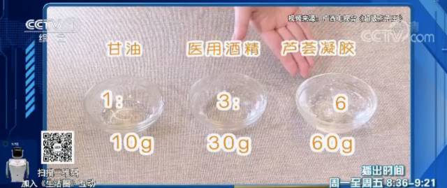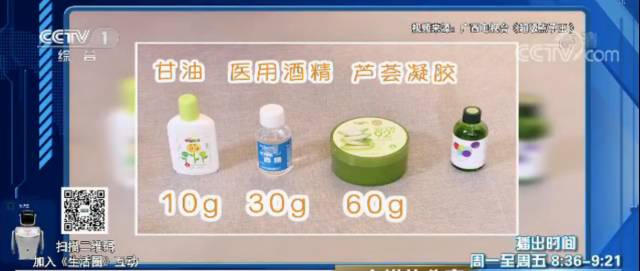 小貼士:95%的醫(yī)用酒精和甘油及蘆薈凝膠混合在一起,會(huì)稀釋酒精的濃度,再用來洗手就不會(huì)傷皮膚了。